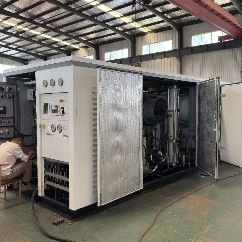 An integrated skid is an integration of a hydrogen refueling station, such skid integrates the hydrogen compressor, cooling system, buffer tank and refueling/metering/control systems, thus achieving hydrogen energy compression, metering, and refueling. With an adoption of modular and integrated design, the hydrogen refueling station with integrated skid can facilitate equipment's overall transportation and installation, thus effectively saving costs for station establishment. Integrated skids of 200 kg/d or 500 kg/d can be manufactured according to customers' demands.